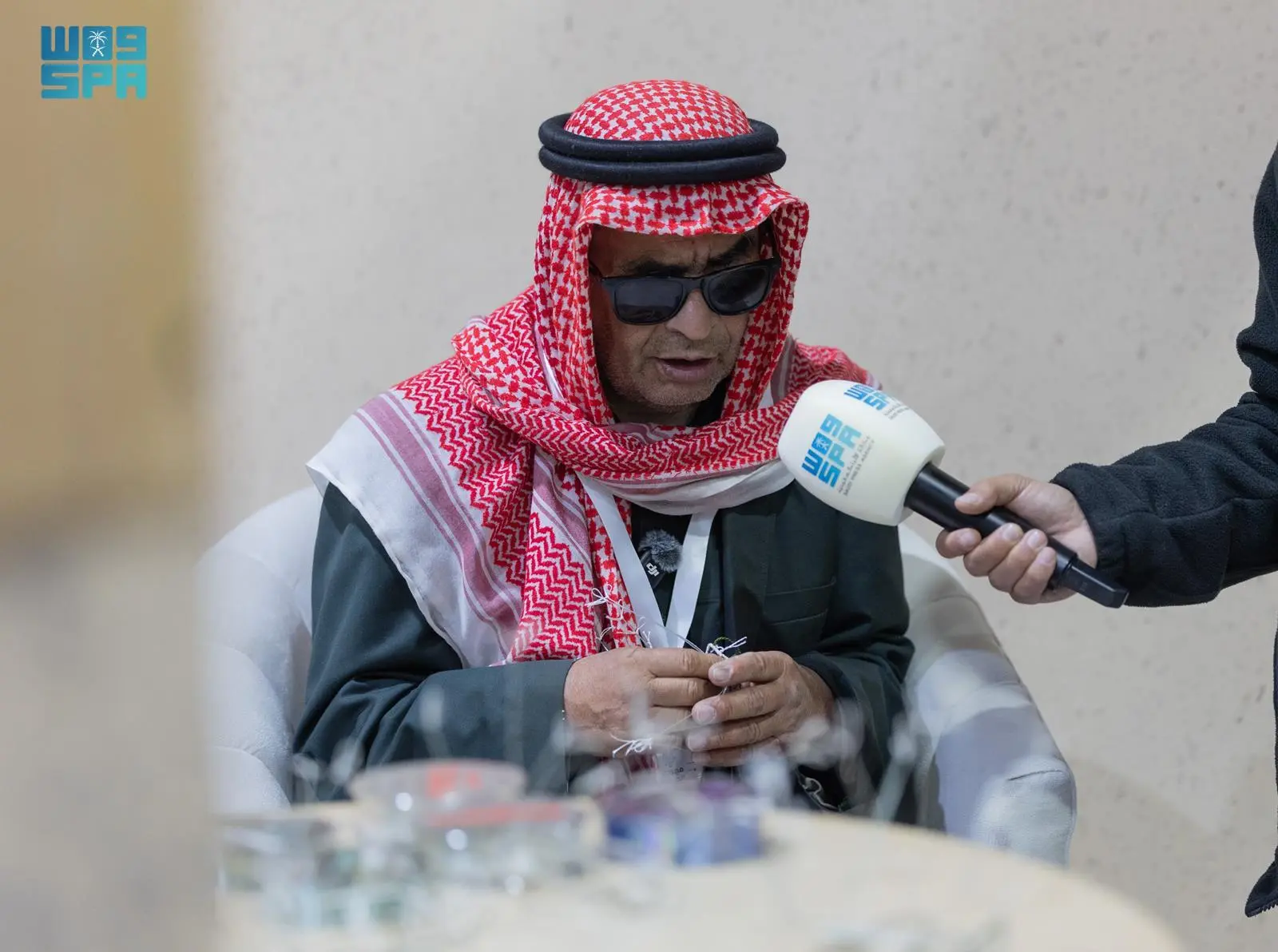 يشارك خلف بن شمران العنزي، وهو كفيف سعودي. في مهرجان الصقور، بمنطقة…
